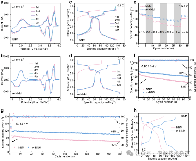 (a) NNM 和 (b) m-NNM 电极在 1.5-4.0 V 电压区间、0.1 mV s-1 扫速下的循环伏安曲线。(c) NNM 和 (d) m-NNM 电极在 0.1 C 电流密度下(1 C = 200 mA g-1)前5圈的充放电曲线。(e) NNM 与 m-NNM 电极的倍率性能。(f) 0.1 C 和 (g) 1 C 电流密度下 NNM 与 m-NNM 电极的循环性能。(h) 1 C 电流密度下 NNM 与 m-NNM 电极第 100 圈的充放电曲线。