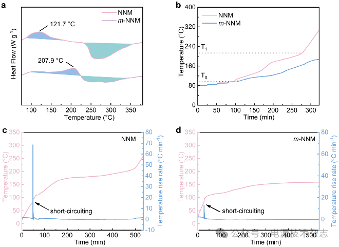 (a) NNM和m-NNM电极在碳酸酯电解液中的DSC曲线。(b) NNM和m-NNM正极在绝热温度上升测试中的温度变化曲线。(c) NNM电池在绝热短路过程中的温度和温度上升率变化曲线。(d) m-NNM电池在绝热短路过程中的温度和温度上升率变化曲线。